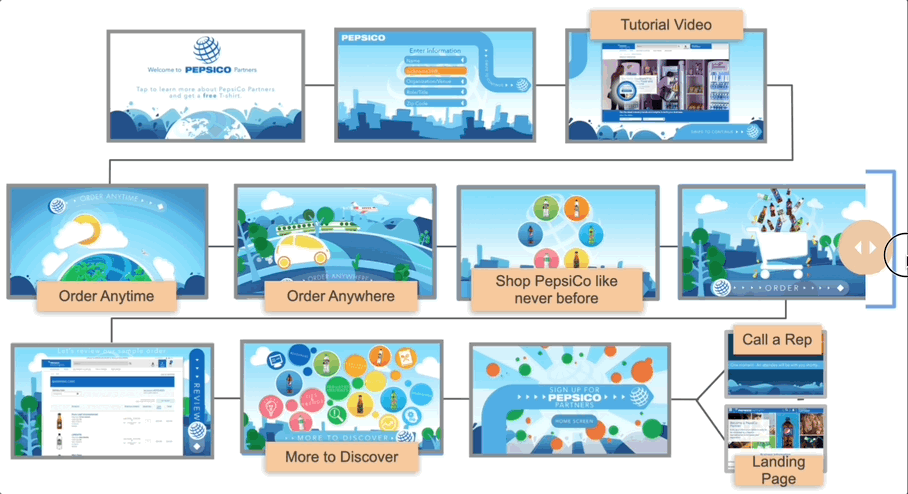 For the PepsiCo Partners trade show, my objective was to create an interactive multi-device touchscreen experience that would captivate attendees and drive lead generation. I led the development of all digital and software aspects, managing a cross-functional team of designers and developers on an aggressive schedule. My role spanned the entire project lifecycle, from facilitating initial ideation and strategy sessions to presenting prototypes to stakeholders and guiding the project through multiple rounds of iterative testing based on user feedback.