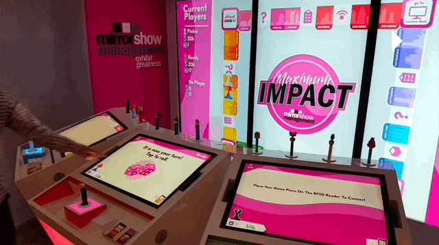 The entire experience was anchored by a central, wall-sized display that updated in real-time with player movements and scores, creating a focal point for both players and spectators. Key interactions were designed to be highly engaging, such as using gestural input to roll digital dice. The game also featured “chance” cards that introduced strategic risk, with a clever twist: players could use a special “MSM Saves the Day” card to negate negative effects. Hopefully this stuck as a memorable metaphor for MSM’s value proposition of turning challenges into opportunities.